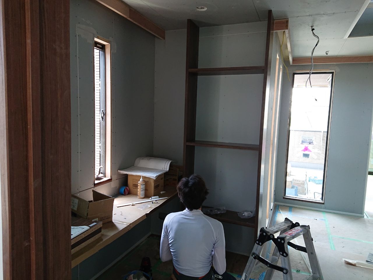 LDKカウンター横の本棚が組み上げられていきます。これだけで10万円弱しますが、改めて見てもちょっとコストパフォーマンスが良くないですね。パナホームブックシェルフよりは質感は良いですが。