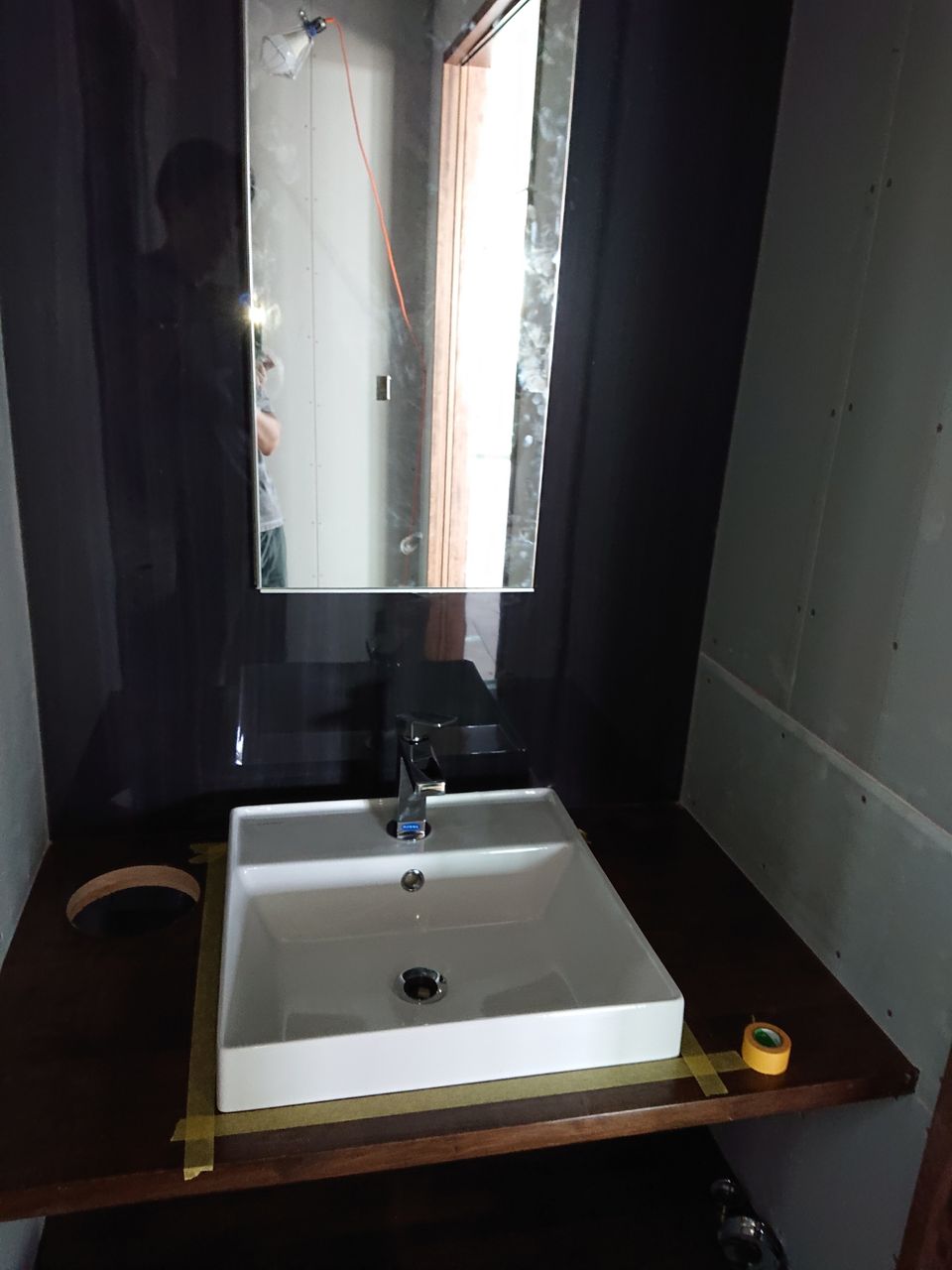家の内部では2階の洗面台の造作が進んできました。何故か水道屋さんがシンクなどを取り付けています。「これは水道屋さんの業務範囲ですか?」と聞いたところ、「そういう細かい指示は無いし、待っていたら水道工事ができないので自主的にやれることはやっています(笑)」とのこと。