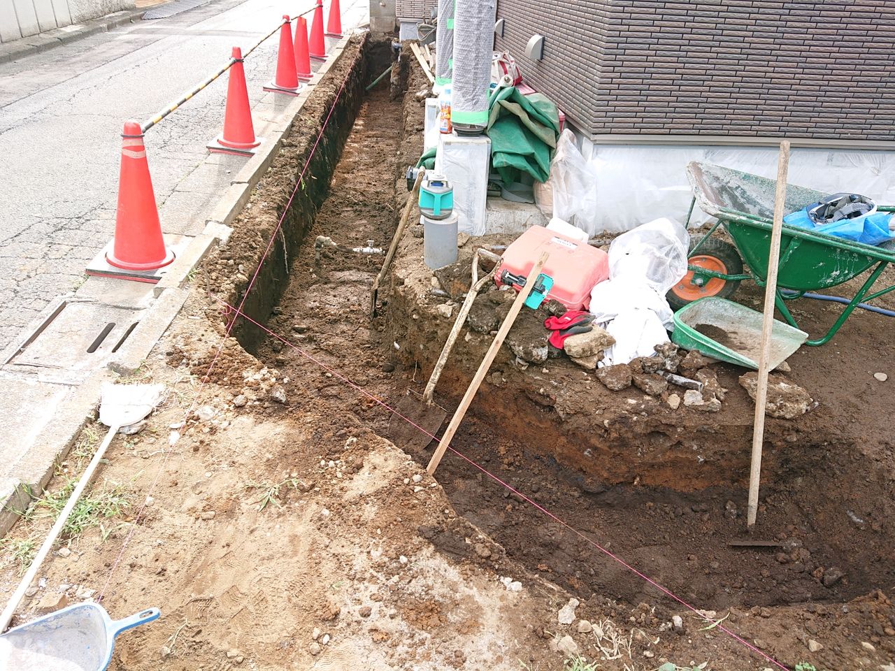 当初は区による側溝工事が終わった後に塀の工事を始める予定でしたが、工事期間も長くは取れないことからすぐに始めています。まずは基礎工事からです。高さが1m無い塀ですがかなり掘っています。