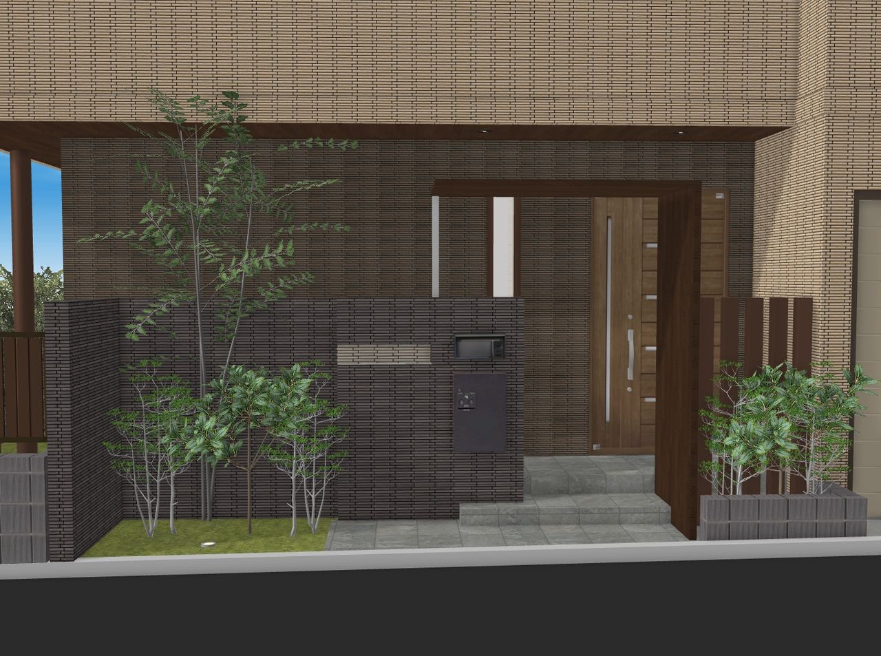 前回も掲載した以下のパース図ですが、今回の解釈に従えばまず左端近くにある道路に対して垂直な塀は30cm以上短くする必要があります。また、左端のフェンスは開放性が高いフェンスに変える必要もあります。さらに玄関前のポイントルーフも屋根があることからこちらも建物に30cm以上近づけて設置する必要が出てきます。